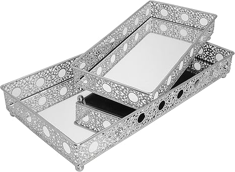 Includes a mirrorMULTI-USE FUNCTIONALITY- Great as a decorative or vanity tray. These tray sets glimmer and shine with their intricate tray design metal surfaces and glass bottles. Bathroom Shelves Cabinets.