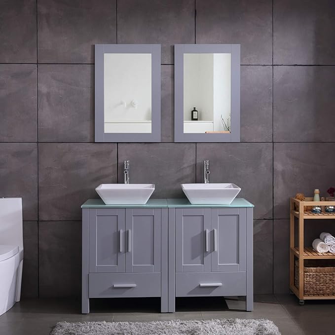 48 Double Sink Bathroom Vanity Cabinet Combo Glass Top Grey Paint Mdf Wood W Faucet Mirror Drain Set Amazon In Home Kitchen